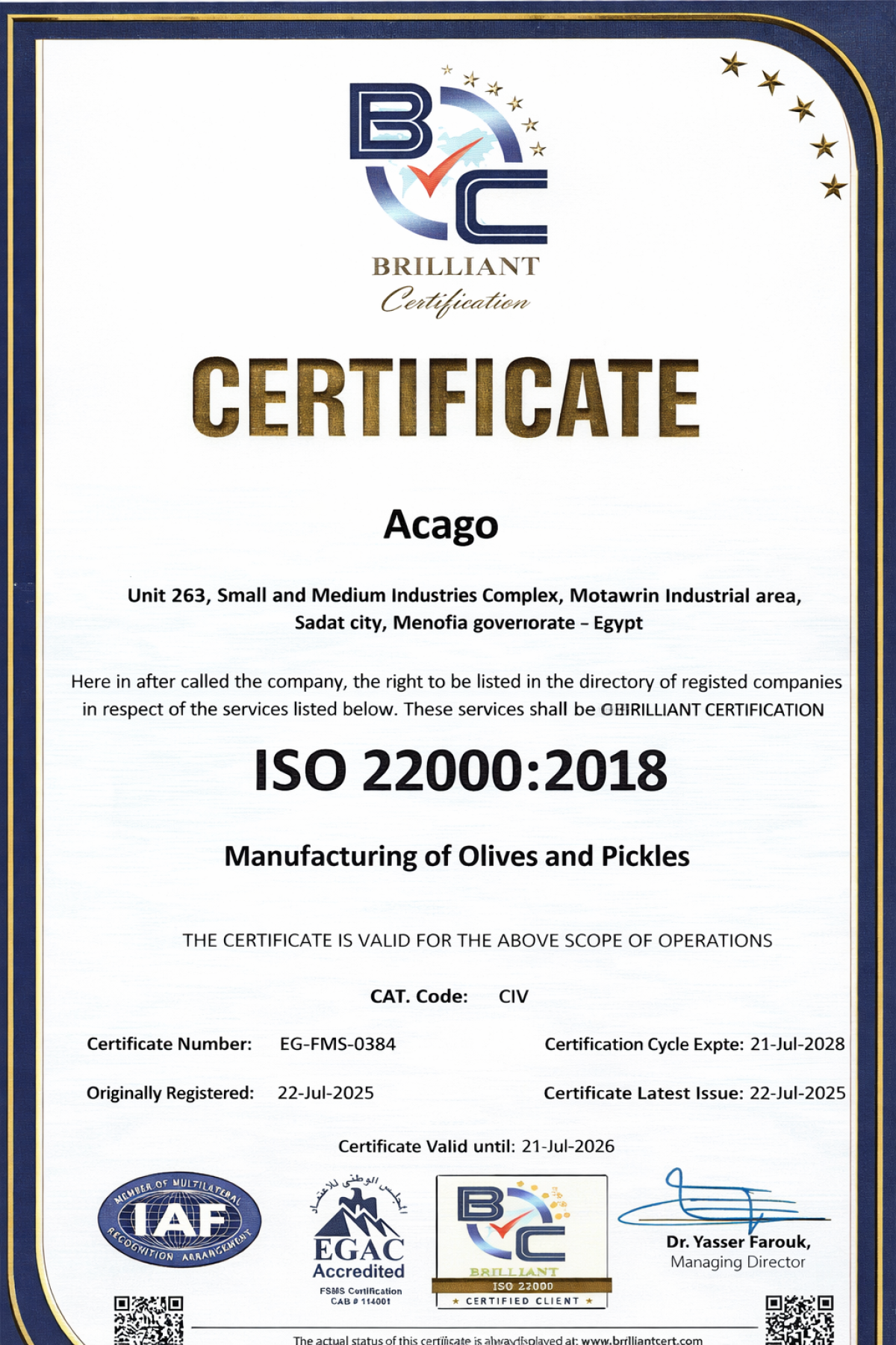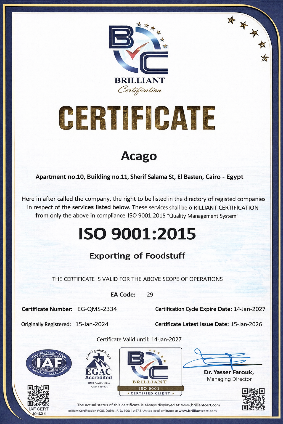 التزامنا بمعايير السلامة الغذائية، والمواصفات الأوروبية، والاستدامة، وبناء الشراكات طويلة الأمد، يجعل من أكاجو شريكًا موثوقًا في الأسواق العالمية.
